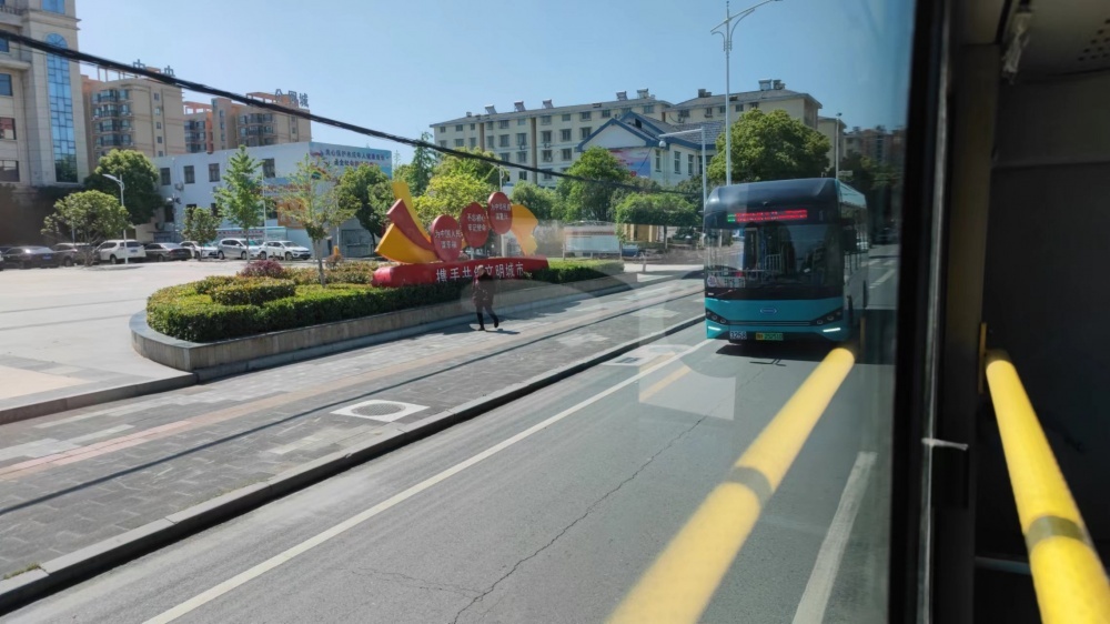 圖/團(tuán)林鎮(zhèn)街道上運(yùn)行的新能源公交車