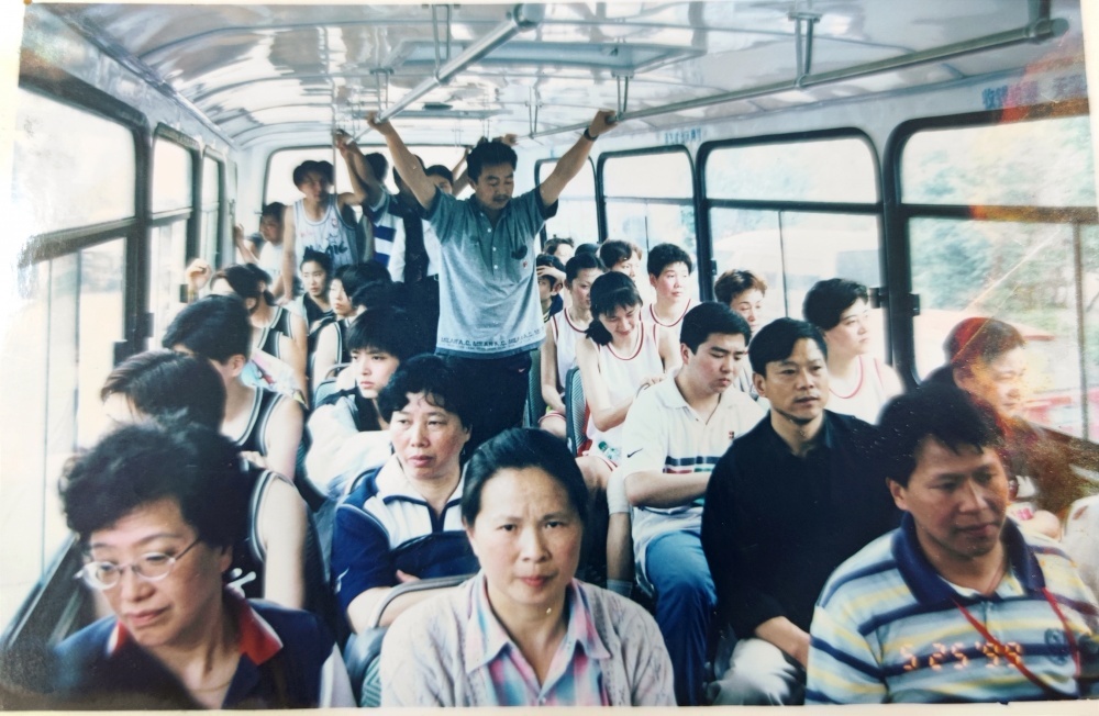 ▲1999年5月25日,沈陽(yáng)電梯隊(duì)隊(duì)員、教練乘坐公交出行。公交車頭還掛有“荊門公交熱忱為女籃服務(wù)”橫幅。