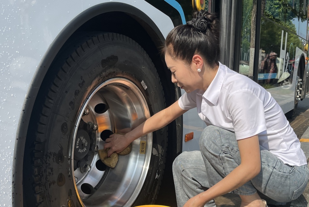大太陽(yáng)底下,他仔細(xì)檢查每一處,就為了保障公交車(chē)能順順當(dāng)當(dāng)跑。