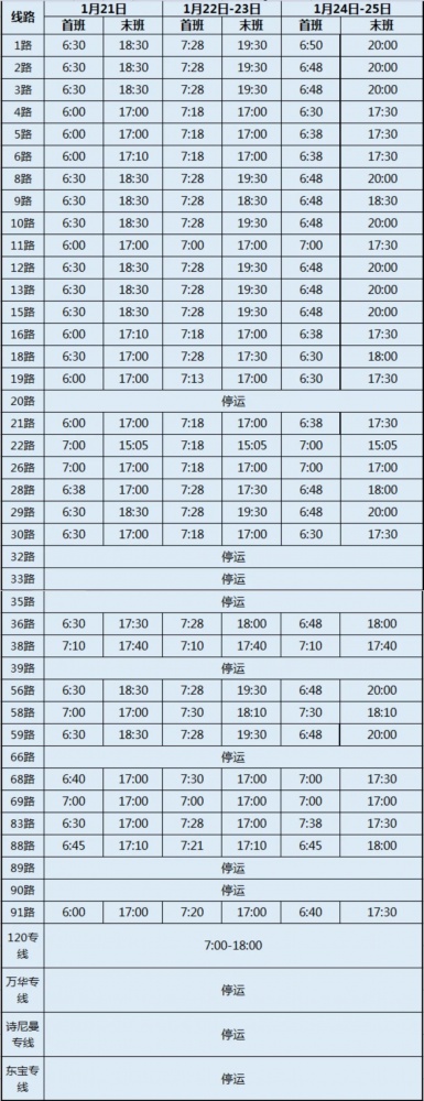春節(jié)期間,市公交集團公交線路營運計劃有調(diào)整。2023年1月21日-1月25日(除夕至初四)各營運線路相較平常在首末班次、發(fā)班間隔上有所變化,為方便廣大市民春節(jié)前后出行,現(xiàn)將春節(jié)期間公交營運安排通告如下: